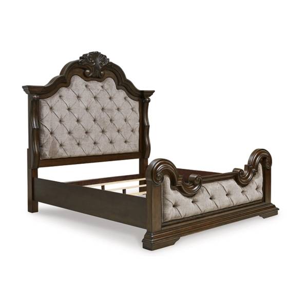 Elevate the grandeur of your bedroom with the Maylee California King Upholstered Bed, an opulent centerpiece that blends timeless design with modern sophistication. This bed’s impressive scale and intricate ornamental appliques make an unforgettable statement. Its sculptural ornate details and elegant button-tufted upholstery create a rich visual impact, embodying a classic aesthetic that feels right at home in any luxurious setting.