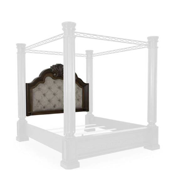 The bed is crafted from a blend of hardwood solids, oak veneer, MDF substrates, and cast resin components, all finished in a deep, dark brown hue that enhances its classic beauty. The metal canopy complements the traditional design, creating a seamless fusion of elegance and modern appeal. The foam-padded headboard is upholstered in soft polyester fabric, providing both comfort and style.