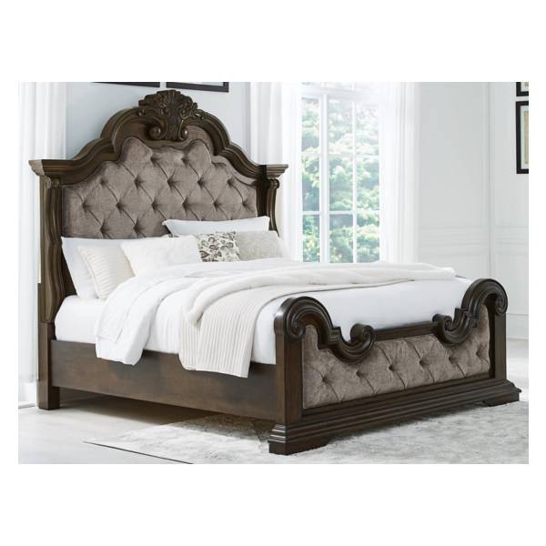 Elevate your bedroom with the timeless elegance of the Maylee Queen Upholstered Bed, a masterpiece of classic design and modern comfort. With its grand scale and intricate ornamental appliques, this bed commands attention as the centerpiece of any bedroom. The sculptural ornate details and beautifully button-tufted upholstery on both the headboard and footboard enhance its luxurious appeal, delivering a sophisticated look that never goes out of style.