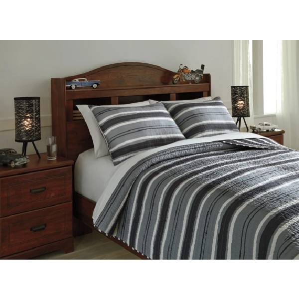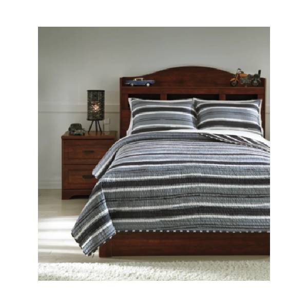 Reversible Full Coverlet Set Elevate your bedroom décor with this versatile full coverlet set, offering two stylish looks in one. One side features a fashion-forward graphic stripe pattern, while the other showcases a smaller stripe design, both in cream and shades of gray. Crafted for comfort and style, this set includes one coverlet and two pillow shams, all made from soft polyester with a polyester/cotton filling. Easy to care for, it’s machine washable and imported.