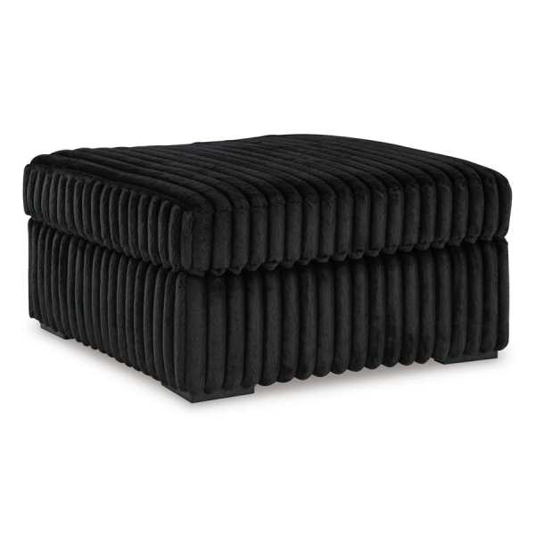 Accompanying the sofa, the oversized accent ottoman offers a firmly cushioned surface with high-quality foam wrapped in poly fiber. Its sturdy corner-blocked frame and exposed feet with a faux wood finish complete the design, making it a stylish and functional addition to your living room. Whether used as a footrest, extra seating, or a convenient surface for trays and décor, this ottoman enhances the luxurious feel of the Midnight-Madness collection.