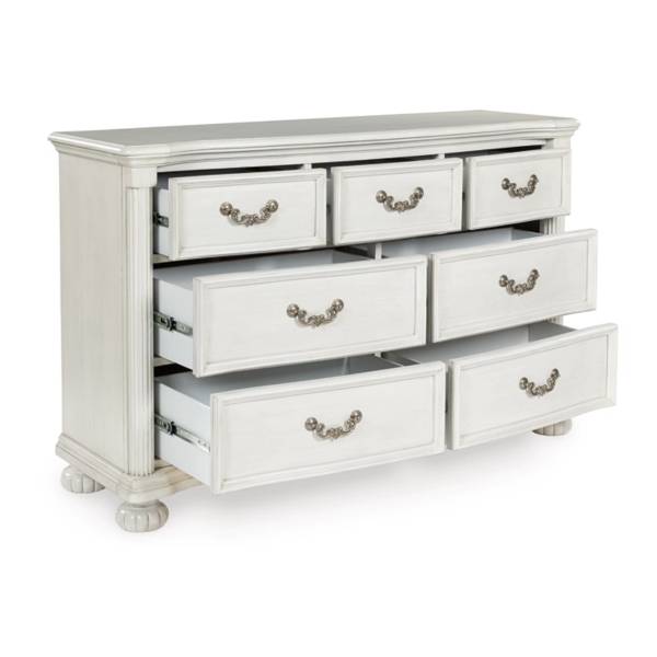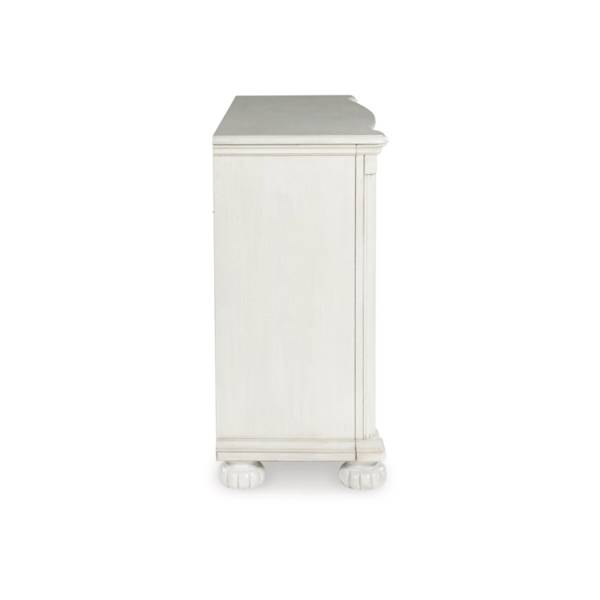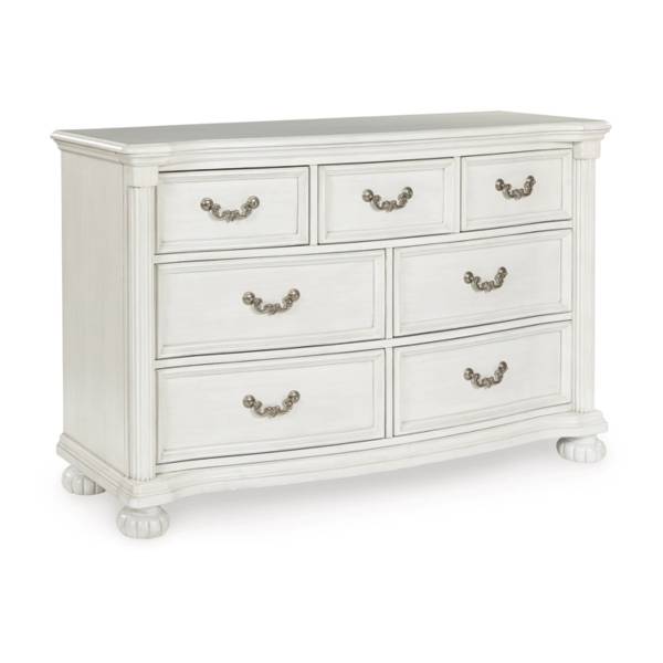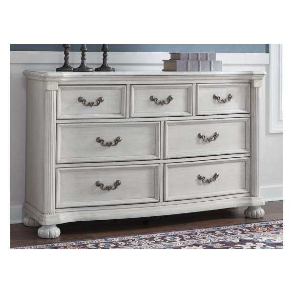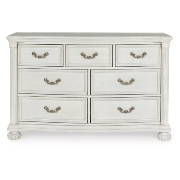Elevate your bedroom with the timeless elegance of the Montelaine Dresser, available exclusively at Teletime. Designed to transform your space into a serene retreat, this traditionally styled dresser showcases a classic antiqued white finish that exudes charm and sophistication. The serpentine-shaped front, adorned with thick decorative moulding, adds graceful curves and architectural detail, creating a stunning focal point for your room. Complementing the refined design are reeded bun feet, which offer a touch of relaxed elegance and vintage appeal.