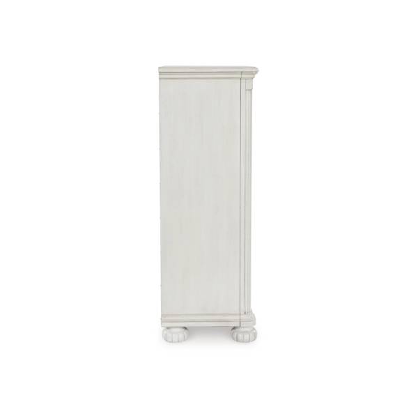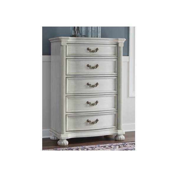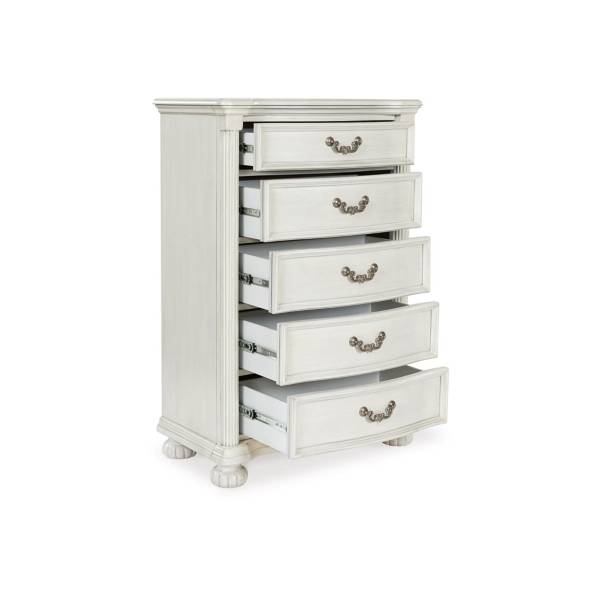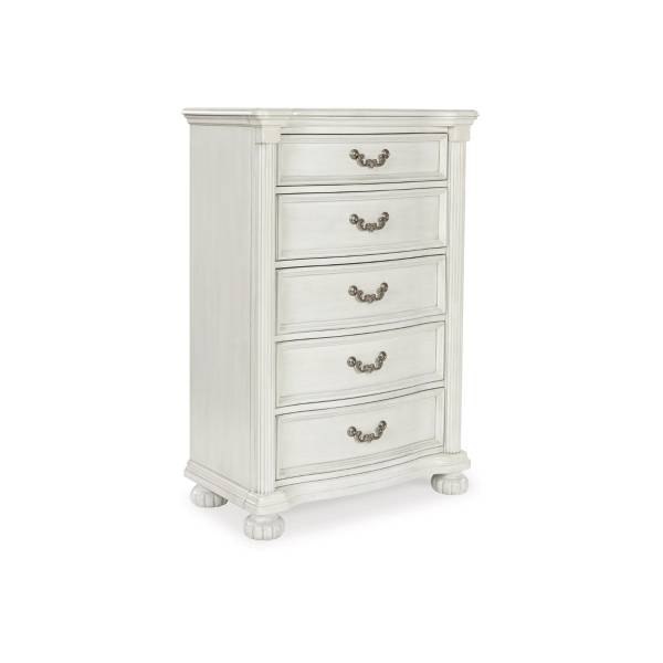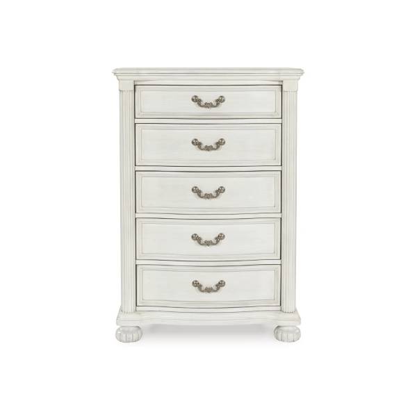The Montelaine Five Drawer Chest exudes timeless elegance and practical functionality, making it a sophisticated addition to any bedroom. Crafted with hardwood solids, veneers, and MDF substrates, this chest features cast resin components that contribute to its refined design. The antiqued white finish lends a charming vintage appeal, while the serpentine-shaped front and thick decorative moulding elevate its traditional aesthetic.