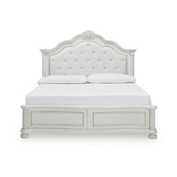 The Montelaine King Upholstered Panel Bed is the epitome of classic, timeless elegance, designed to transform your bedroom into a serene retreat. This traditionally inspired bed features a plush, cushioned headboard with a serpentine-shaped crown, beautifully upholstered in light pearl gray fabric. The footboard, shaped with picture frame molding, adds an additional layer of sophistication to this stately piece. Finished in a classic antiqued white, the bed radiates a soft, inviting charm, while the reeded bun feet enhance its refined, vintage aesthetic.