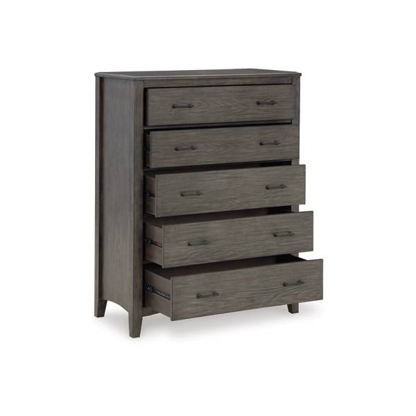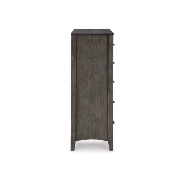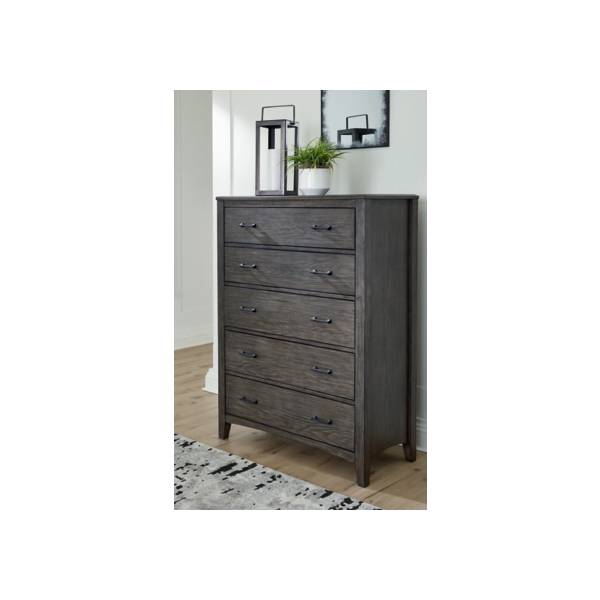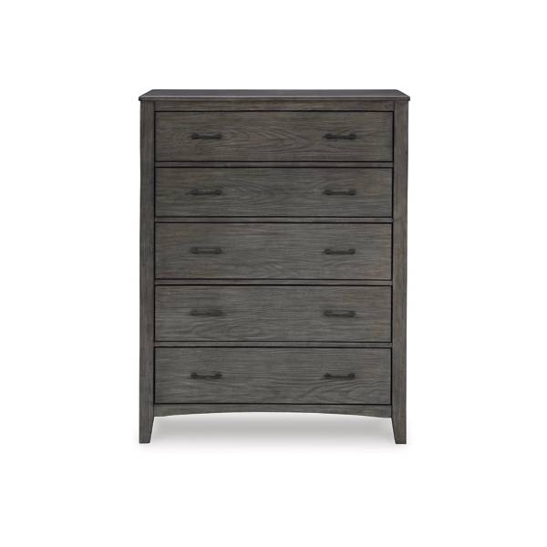 The Montillan Five Drawer Chest blends cool, contemporary design with warm, inviting tones, making it the perfect addition to your bedroom retreat. Embodying casual contemporary style at its finest, this designer piece features a beautifully embossed wood grain texture that enhances its sophisticated appeal. The medium gray-brown finish, contrasted with blackened wood grain detailing, creates a striking yet versatile look that complements a variety of décor styles.;