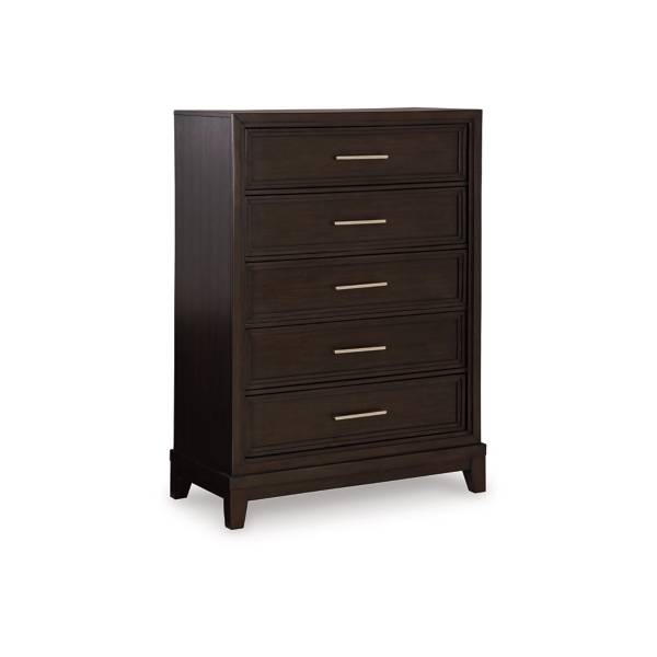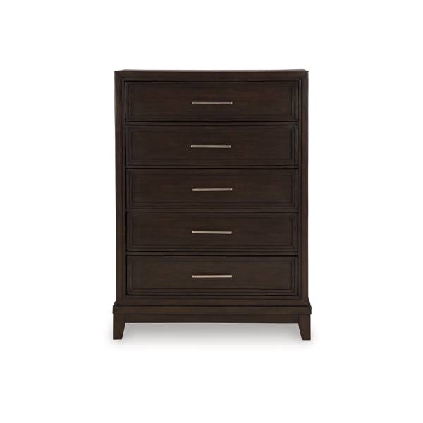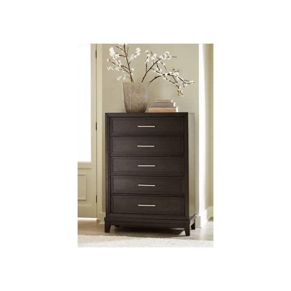 Crafted with hardwood solids, engineered wood, and MDF substrates, the chest features a rich grayish-brown wood-tone finish that complements a variety of décor styles. The five smooth-gliding drawers, constructed with dovetail joinery and heavy-duty ball-bearing side glides, ensure lasting durability and effortless operation. The top drawers are felt-lined, offering a soft and protective space for delicate items, while metal bar pulls in a satin nickel-tone finish provide a sleek and contemporary contrast.