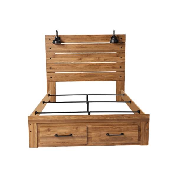 The Pasklyn Queen Panel Storage Bed effortlessly blends rustic charm with industrial flair, creating a sophisticated yet relaxed vibe in your bedroom. Its rich honey brown finish over replicated walnut grain gives the bed an inviting warmth, while the unique design provides both style and practicality. The bed’s refined casual aesthetic elevates any space, offering a versatile foundation for a variety of bedroom décor styles.