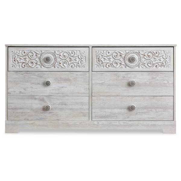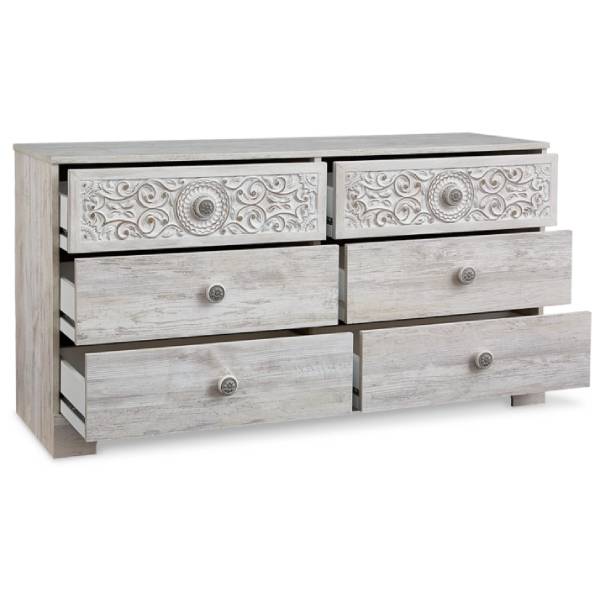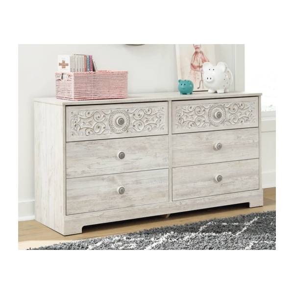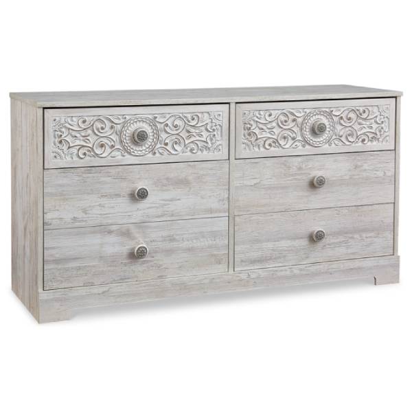 Transform your bedroom into a serene coastal retreat with the Paxberry Six Drawer Dresser, available at Teletime. This beautifully crafted piece brings a blend of cottage charm and coastal chic to your space with its whitewashed finish, evoking the essence of weatherworn elegance. The authentic worn-through paint effect adds character, making it a stylish focal point in any bedroom. Tasteful medallion drawer pulls complement the dresser’s clean lines, enhancing its high-end aesthetic while maintaining an inviting, relaxed feel.
