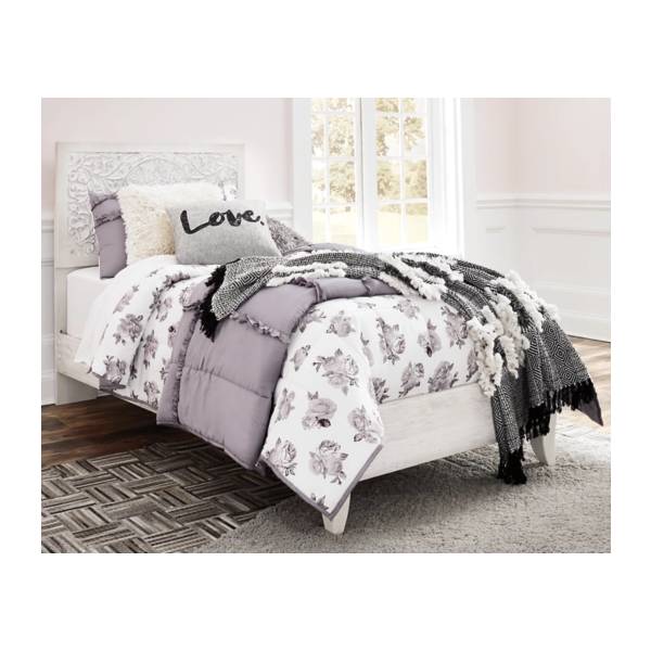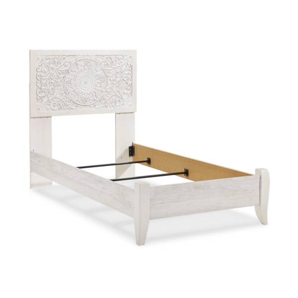 Let your young trendsetter express her free-spirited style with the Paxberry Twin Panel Bed, a chic and charming addition to any bedroom. The bed features an exquisitely carved medallion pattern on the headboard, capturing the essence of boho elegance and creating a room filled with personality and flair. The beautiful whitewashed finish evokes a rustic yet timeless appeal, setting the stage for a space brimming with individuality.