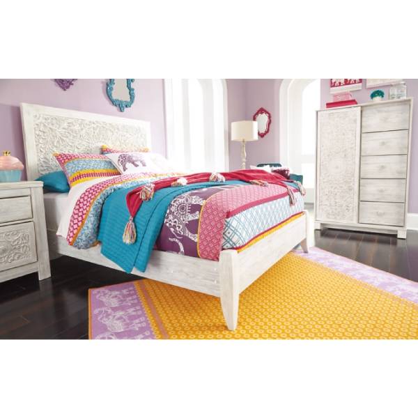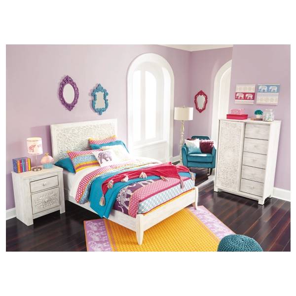 Let your young trendsetter express her free-spirited style with the Paxberry Twin Panel Headboard. Showcasing an exquisite carved medallion pattern, this headboard embodies boho-chic charm, making it a stunning focal point in any bedroom. The beautifully distressed whitewashed finish adds vintage appeal, creating a warm and inviting space filled with personality.