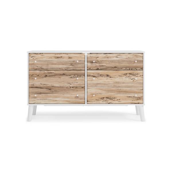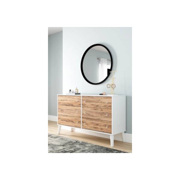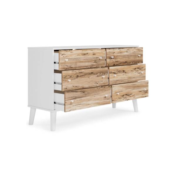 Elevate your bedroom with the Piperton Six Drawer Dresser, exclusively at Teletime. This dresser beautifully blends contemporary design with casual charm, making it a stylish and practical addition to your space. Its striking two-tone appearance, featuring a matte white finish and drawer fronts with a replicated sugarberry wood grain pattern, adds warmth and modern flair to any room.