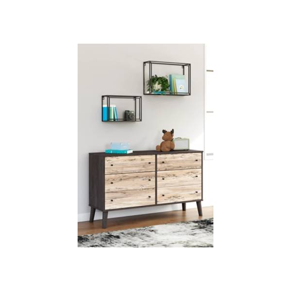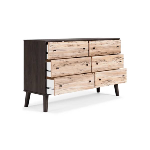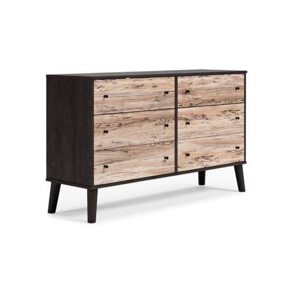 The Piperton Six Drawer Dresser from Teletime beautifully blends simplicity with contemporary style, making it a delightful addition to any bedroom. Its expressive two-tone design showcases a dark charcoal finish over replicated oak grain, perfectly contrasted by a replicated sugarberry wood grain for added warmth and visual appeal. Splay legs and matte black knobs provide a modern touch, enhancing the dresser's sleek and refined look.