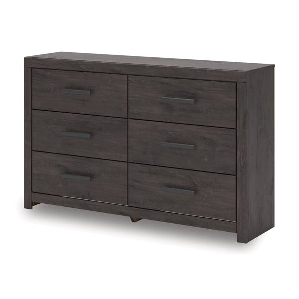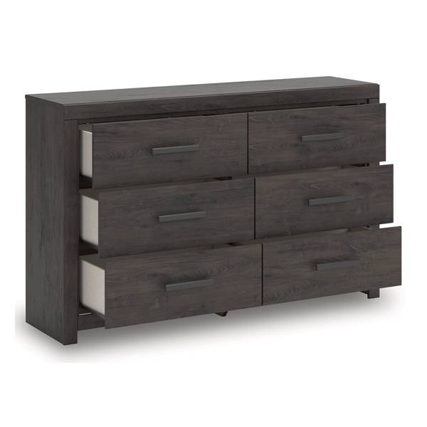 Elevate your bedroom with the Prendonea Six Drawer Dresser, available exclusively at Teletime. Thoughtfully designed for everyday living, this dresser brings a refined touch to modern interiors. Its dark charcoal finish, blending black and brown undertones, offers a versatile aesthetic that seamlessly complements a variety of decor styles. Framed drawer fronts and pilasters add subtle detailing, enhancing its contemporary appeal.