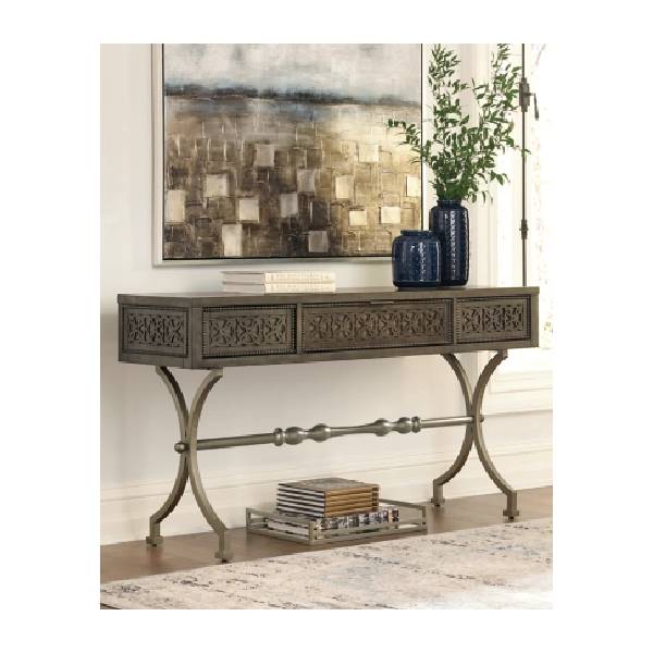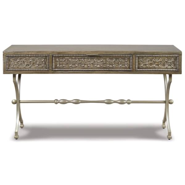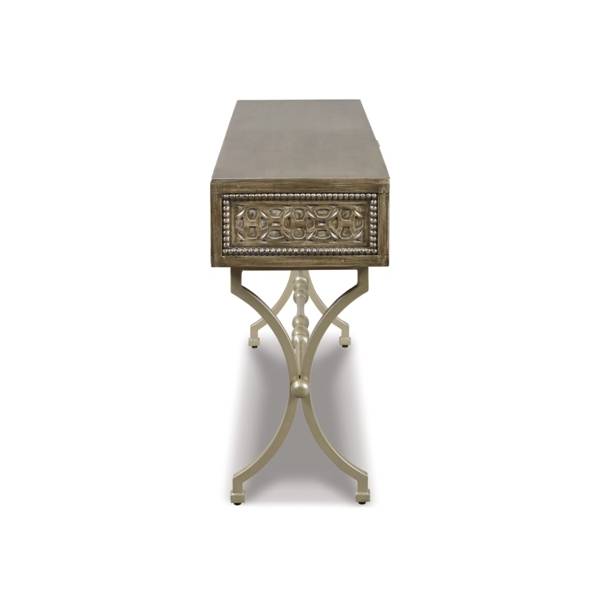 This console sofa table features a medallion pattern, antiqued gray wood, champagne-tone metal, and an X-base design, offering stylish decor display and functional storage with a convenient drawer.