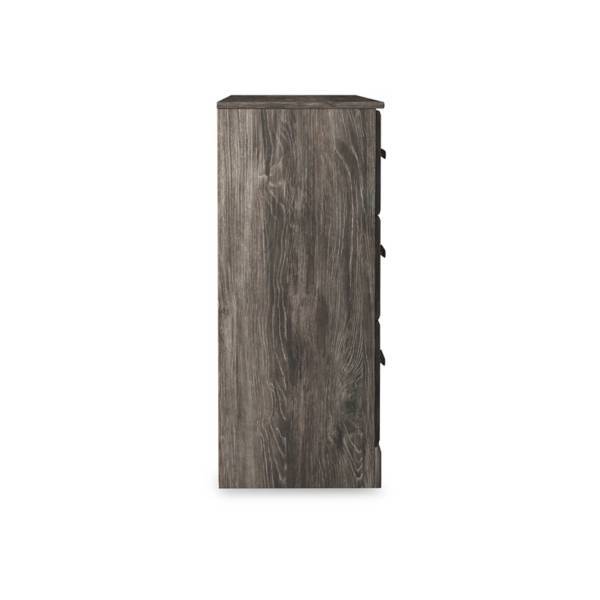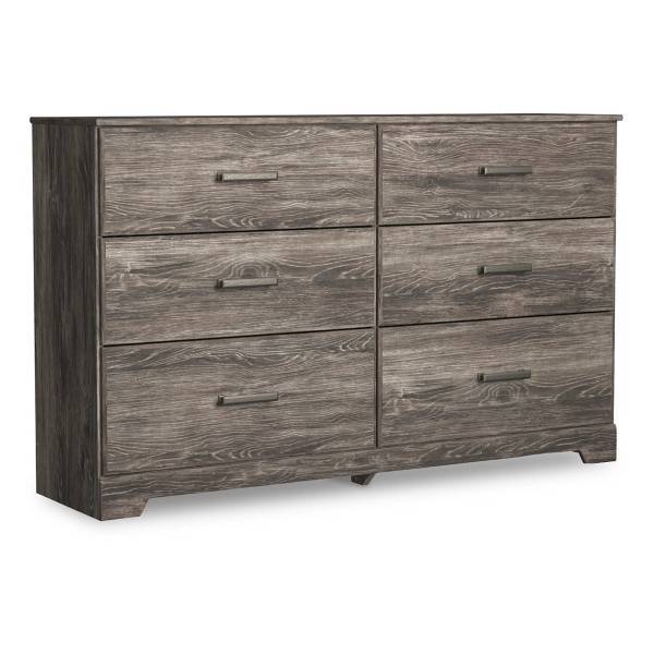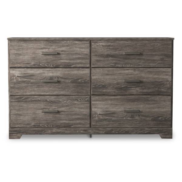 The Ralinksi Six Drawer Dresser offers a modern twist on classic design, bringing a fresh style to your space. Its warm gray finish over replicated oak grain adds a rustic yet refined touch, effortlessly complementing other pieces in your room. The sleek drawer fronts and large, antiqued pewter-tone handles complete the piece with a stylish and functional flair.