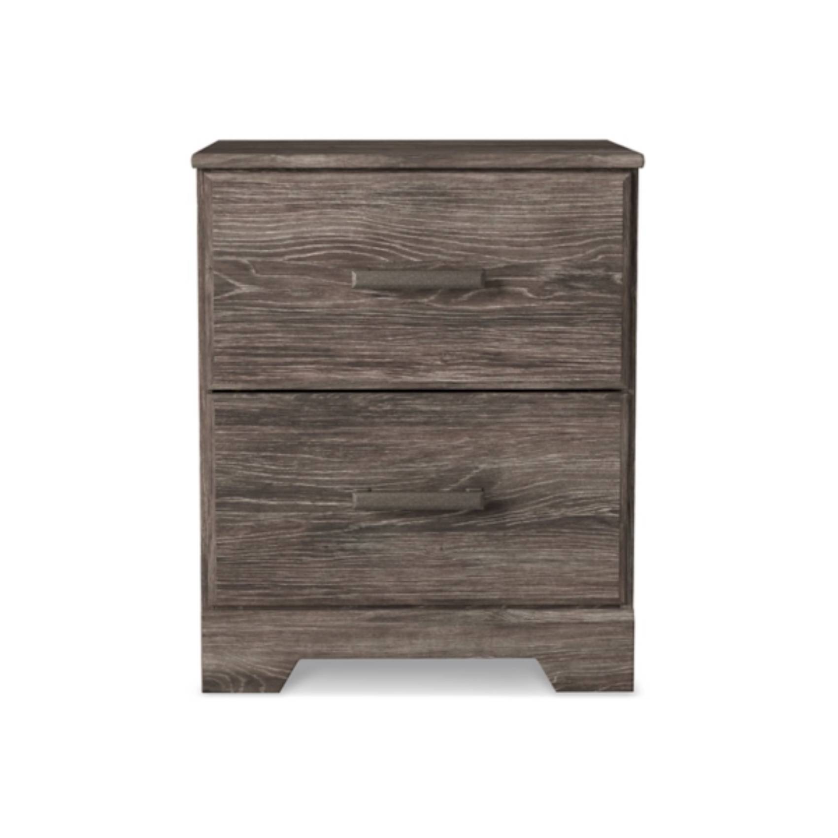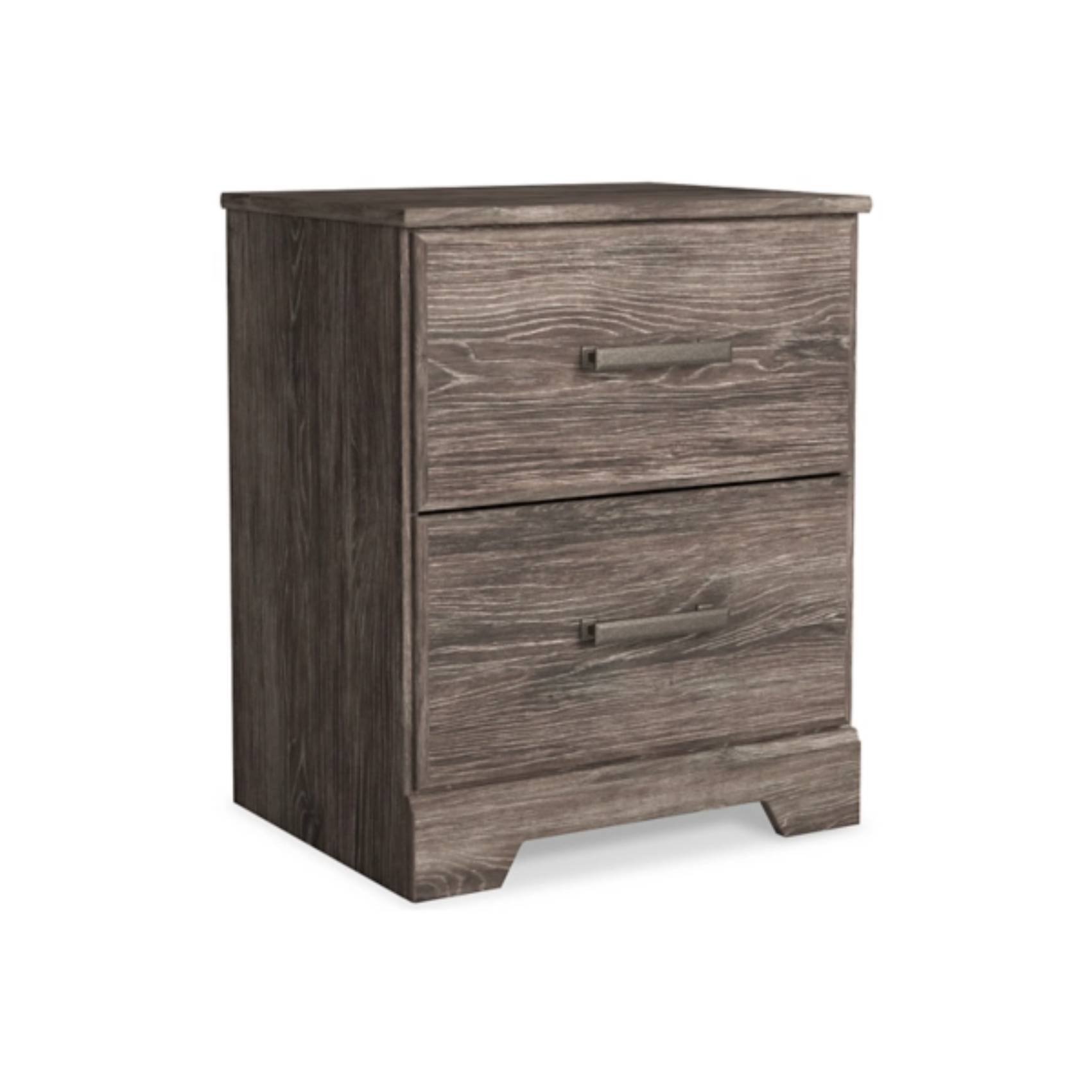 Add a refreshing touch of modern rustic charm to your bedroom with the Ralinksi Two Drawer Night Stand, available at Teletime. Designed with clean lines and a contemporary attitude, this nightstand features a warm gray finish over a replicated oak grain that exudes natural character with an authentic textured look. The subtle yet stylish design blends effortlessly with a variety of bedroom décors, making it a versatile addition to any space. Two smooth-gliding drawers provide practical storage for your bedside essentials, while the large-scale pewter-tone handles offer a striking contrast and add a hint of industrial flair. Expertly crafted using engineered wood and durable decorative laminate, this nightstand offers the perfect balance of durability, functionality, and affordability. Whether paired with matching pieces or styled on its own, the Ralinksi Night Stand delivers everyday convenience with a polished, sophisticated edge—exclusively from Teletime, where quality and style come together seamlessly.