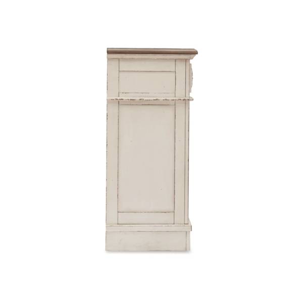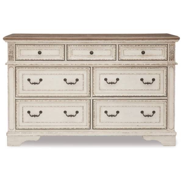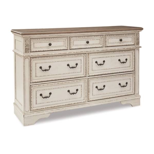 Transform your bedroom into a peaceful retreat with the Realyn Dresser, a stunning piece that perfectly embodies the charm of traditional cottage styling. Featuring a captivating two-tone design, this dresser combines a soft, chipped white finish with a distressed wood-finished top, exuding an inviting rustic appeal. Framed drawer fronts and decorative corbels provide elegant detailing, while the dark bronze-tone bail pulls offer a timeless, classic accent.