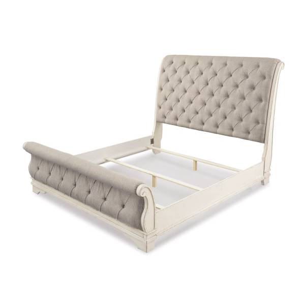 The Realyn Queen Sleigh Bed brings timeless elegance and traditional cottage styling to your bedroom, creating the perfect retreat for restful nights. This beautifully crafted bed features a graceful, curvaceous design that exudes charm and sophistication. The distressed chipped white finish offers a rustic yet refined look, giving the bed an heirloom appeal that complements a variety of interior styles.