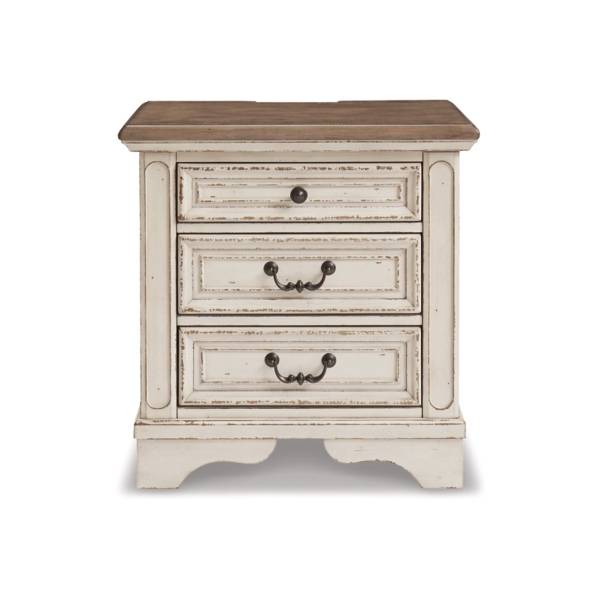 Add a touch of timeless cottage charm to your bedroom with the Realyn Three Drawer Nightstand, available exclusively at Teletime. This beautifully crafted piece captures the essence of traditional elegance while offering the functionality you need for modern living. Its antiqued two-tone finish—featuring a softly chipped white base paired with a distressed wood top—creates a warm, inviting look that effortlessly enhances your bedroom décor.