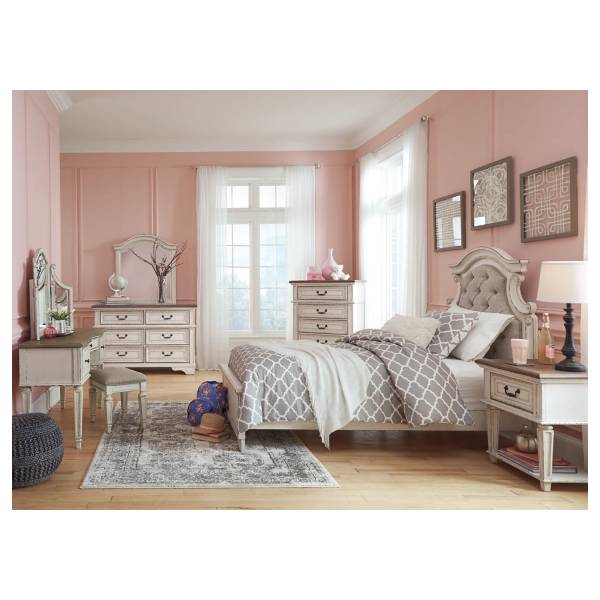 Crafted from a combination of veneers, wood, and engineered wood with cast resin components, the Realyn Twin Panel Bed is both sturdy and durable, ensuring long-lasting use. The set includes the upholstered headboard, footboard, and side rails, creating a cohesive and elegant design.