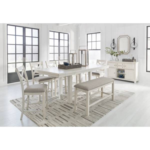 Transform your dining area with this counter height dining bench, where farmhouse charm meets modern elegance. The crisp white finish beautifully complements the light gray upholstery, creating a stylish and welcoming atmosphere for your family gatherings.
