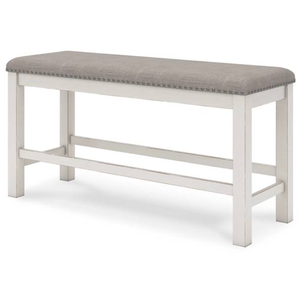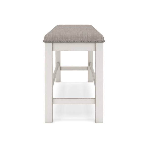 A farmhouse-inspired counter height dining bench with a white finish, light gray upholstery, and nailhead trim. Crafted from durable wood with a foam-cushioned seat for comfort. Assembly required.