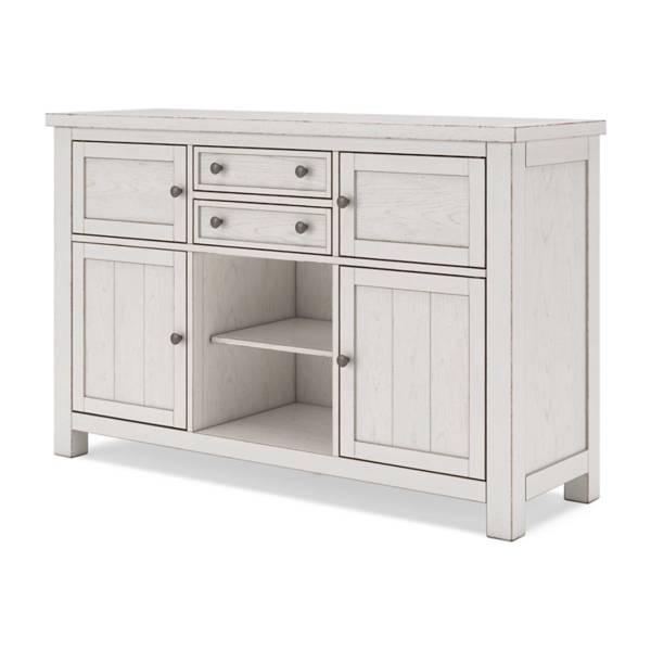 This dining server features an antiqued white finish with planked effect doors, offering stylish farmhouse storage. It includes four cabinets with adjustable shelves, two drawers, and satin nickel-tone hardware.