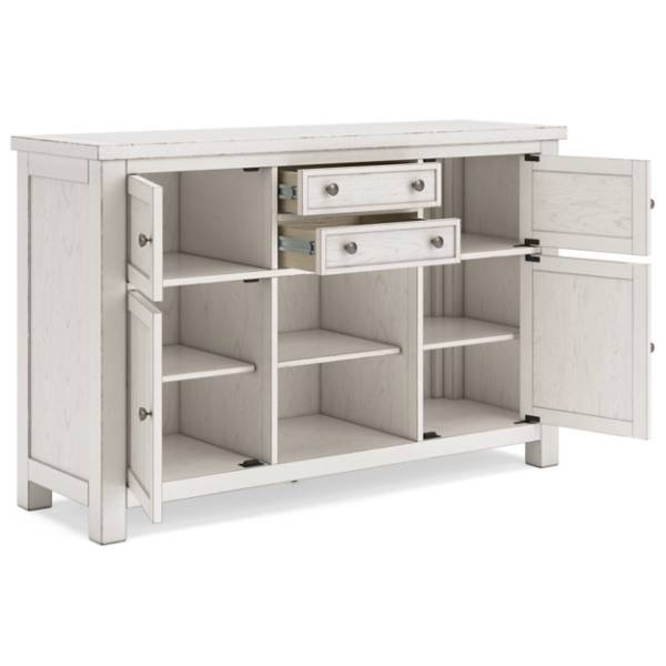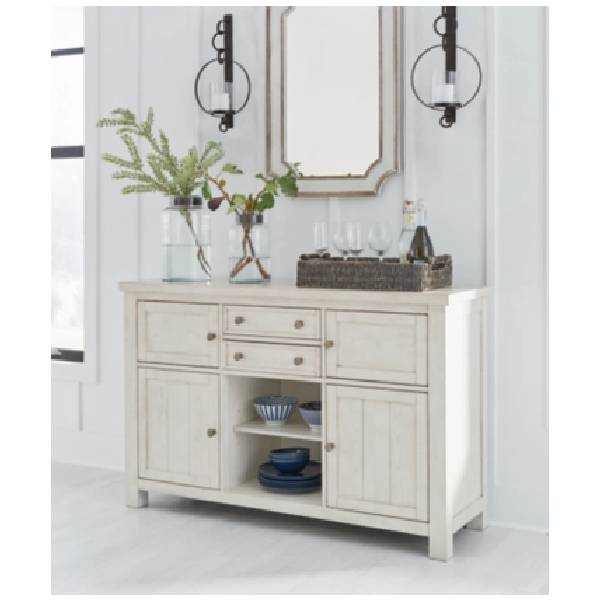 Farmhouse-Style Elegance: This dining server blends functionality with style, featuring an antiqued white finish and planked effect cabinet doors that bring a fashionable touch to farmhouse storage.