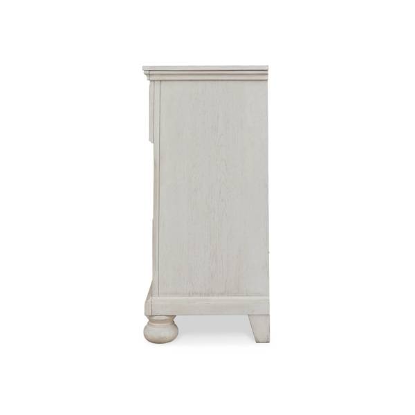 The Robbinsdale Dresser effortlessly elevates your bedroom with its sophisticated and timeless design. The antiqued white finish, complemented by a beautifully textured wood grain, exudes an air of refinement and charm. Its dark bronze-tone knobs add an ornate touch, enhancing the dresser’s classic appeal. The upper drawers feature a felt lining, providing a luxurious feel and added care for delicate items.