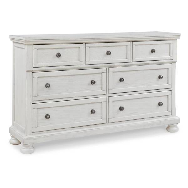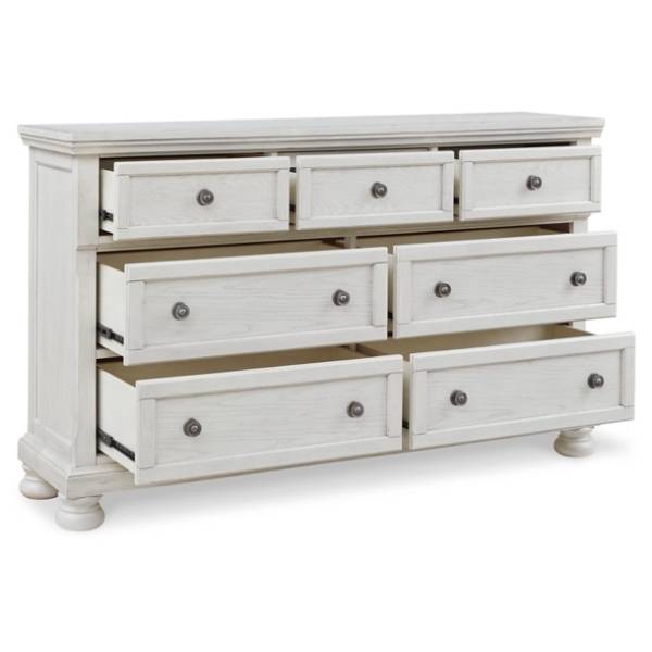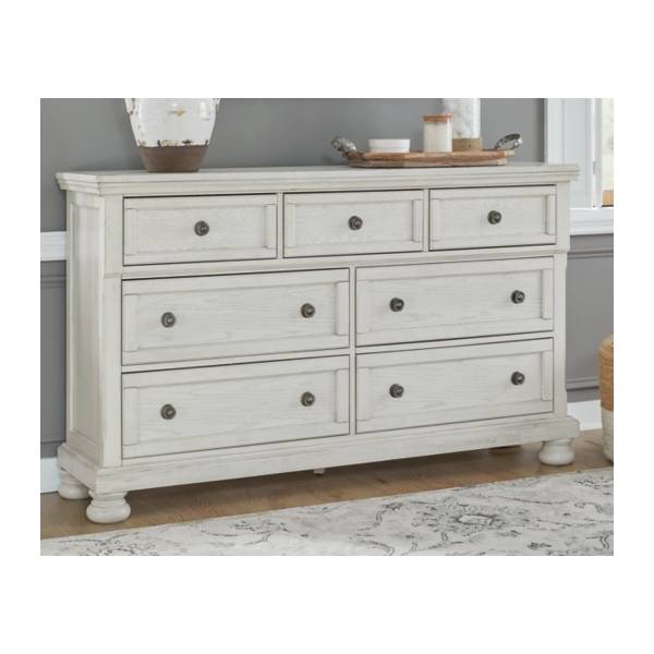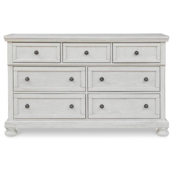 Crafted from select oak veneer, engineered wood, solid wood components, and cast resin, this dresser is built to last while showcasing the finest craftsmanship. Whether you're looking to enhance your bedroom's aesthetic or add functional storage, the Robbinsdale Dresser delivers both in style and utility. Available exclusively at Teletime, this dresser is sure to become a cherished piece in your home, ready to bring sophistication and charm to your living space.