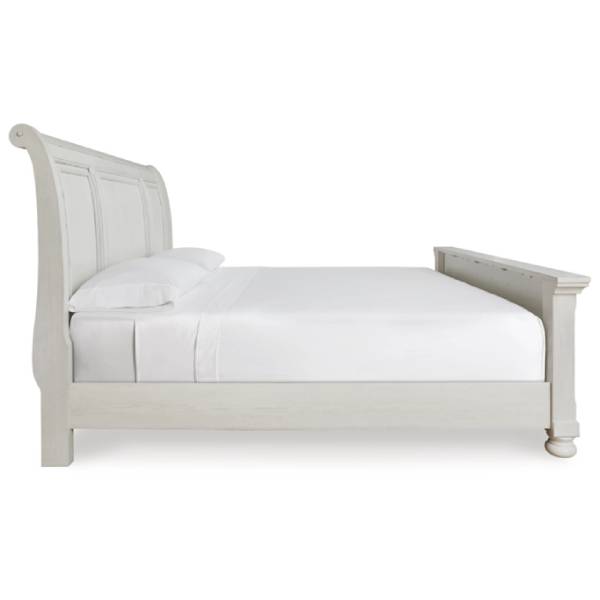 The Robbinsdale King Sleigh Bed from Teletime brings elegance and sophistication to your bedroom with its timeless design. Crafted to elevate the ambiance of your personal retreat, this bed features a classic sleigh silhouette that exudes refined charm. Its antiqued white finish, enhanced with a grain texture, offers a touch of vintage-inspired sophistication, making it a centerpiece of any tasteful bedroom setting.
