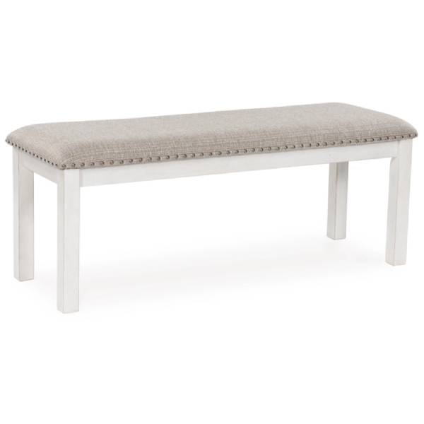 Enhance your dining experience with the Robbinsdale dining bench, a perfect blend of style and comfort. This bench features an antiqued white finish and light gray upholstery, bringing a touch of modern farmhouse charm to your dining space.
