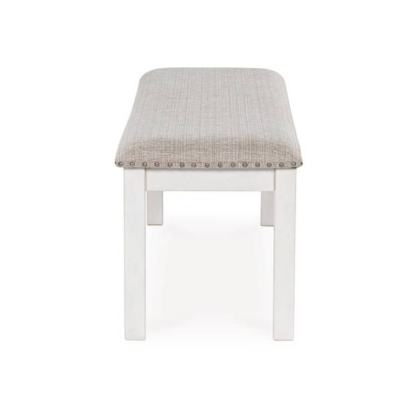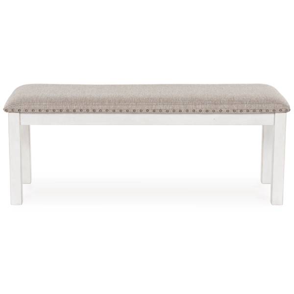 The Robbinsdale dining bench offers modern farmhouse style with its antiqued white finish, light gray upholstered seat with nailhead trim, and solid wood frame, creating a stylish and comfortable seating option.