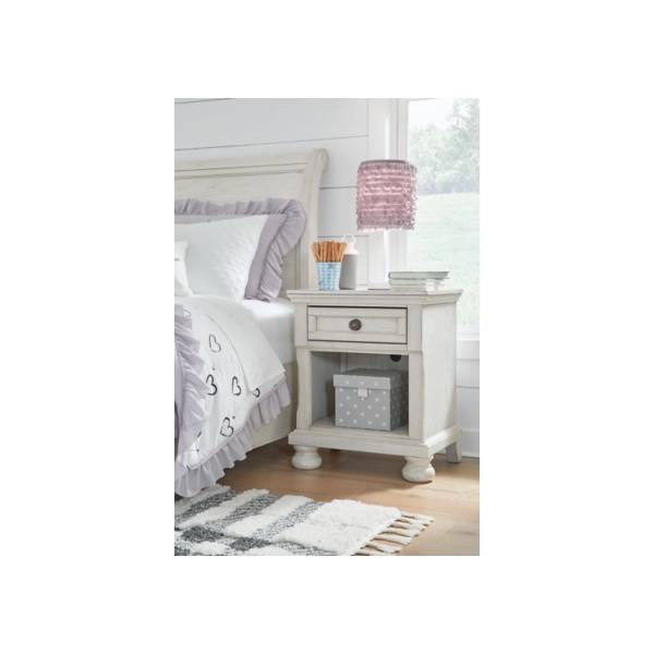 Add a touch of timeless sophistication to your bedroom with the Robbinsdale One Drawer Nightstand, available exclusively at Teletime. Beautifully crafted to elevate classic interiors, this elegant piece features a soft antiqued white finish that highlights a subtle wood grain texture, lending warmth and character to your space. The refined design is accented with a dark bronze-tone drawer knob, offering a vintage-inspired contrast that enhances its traditional charm.