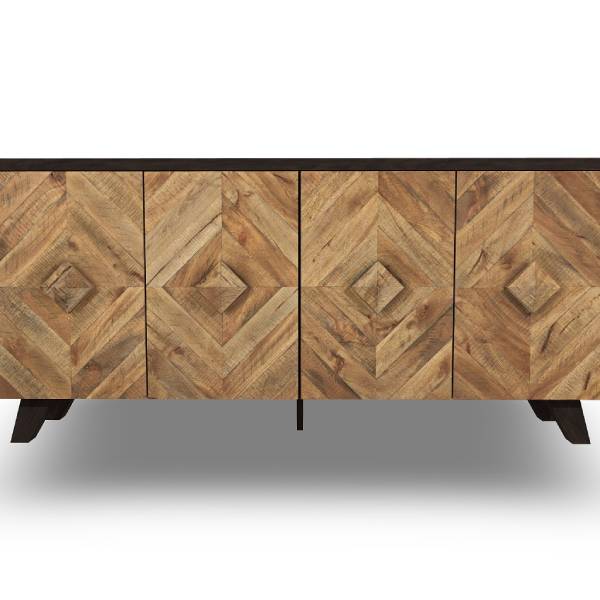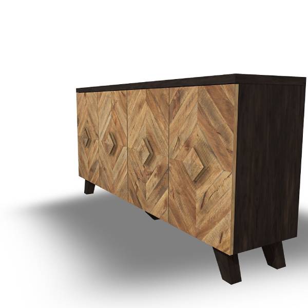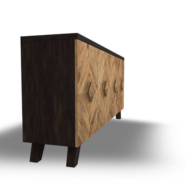 Elevate your décor with the Robin Ridge 4-door accent cabinet, featuring a striking two-tone style. The dark brown exterior contrasts beautifully with the multi-tonal distressed finish on the doors and handles. The diamond-shaped plank effect adds a rich, dimensional touch.