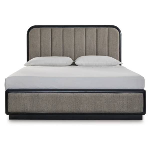 The Rowanbeck California King Upholstered Panel Bed exudes luxurious sophistication with its gracefully curved silhouette and textured wood grain finish. Wrapped in elegant herringbone upholstery, it offers both durability and modern style. This bed is the ultimate statement piece for a refined and contemporary bedroom.