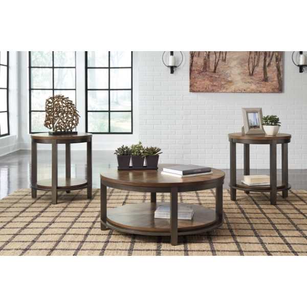 The Roybeck Occasional Table Set (3/CN) offers rustic charm with industrial-inspired design. This set includes a coffee table and two end tables, crafted with a weathered wood finish and metal legs. Perfect for adding character and functionality to your living space.