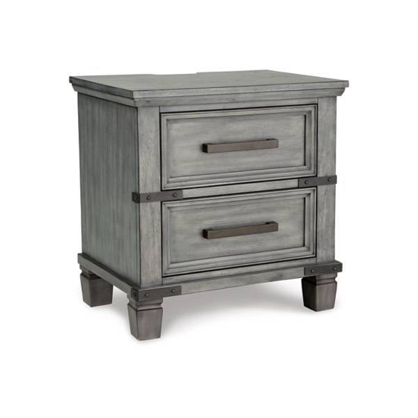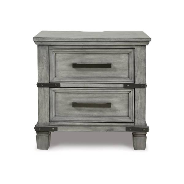Bring rustic charm and modern practicality into your bedroom with the Russelyn Two Drawer Night Stand, available exclusively at Teletime. Designed with a distinct urban farmhouse flair, this nightstand effortlessly blends vintage character with contemporary functionality. The light weathered gray finish offers a soft, worn-in look, while dark aged bronze-tone bar pulls and metal strap accents add an industrial-inspired touch that gives the piece a casually cool aesthetic.