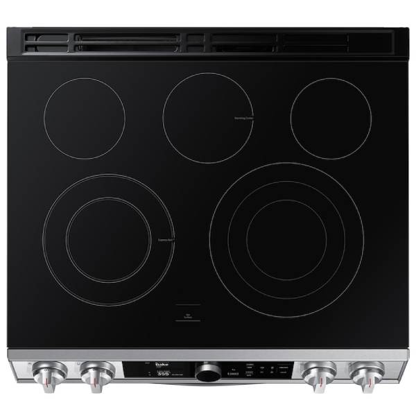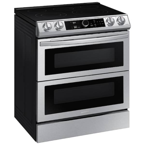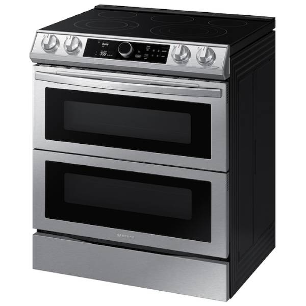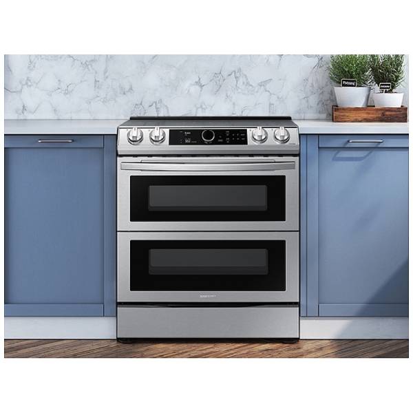 Samsung NE63T8751SS - NE63T8751SS/AC Electric Range, 30 inch Exterior Width, Self Clean, Convection, 5 Burners, 6.3 cu. ft. Capacity, Storage Drawer, Air Fry, 2 Ovens, Stainless Steel colour Dual Fan True European Convection, Temperature Probe, FlexDuo w/ Dual Door, Smart Dial, Telescopic Gliding Extension Rack, Illuminated Knobs