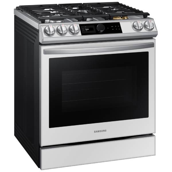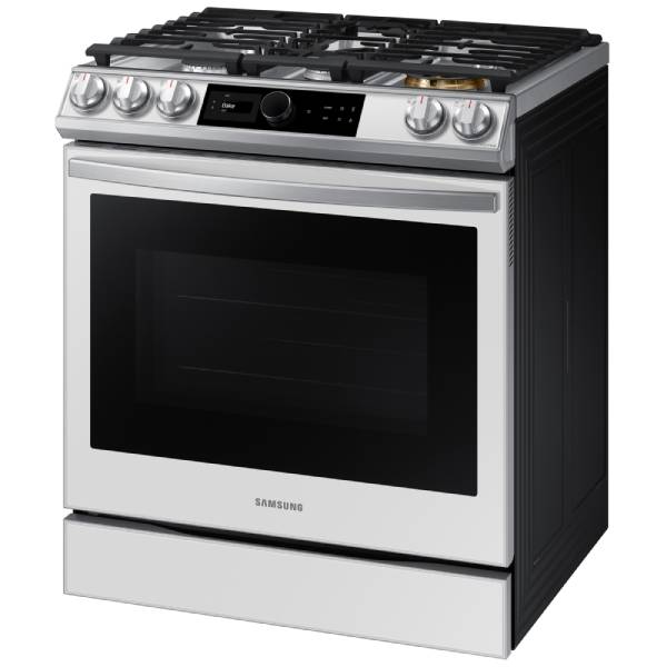 Samsung Bespoke NX60BB871112AA Gas Range, 30 inch Exterior Width, Self Clean, Convection, 5 Burners, 6.0 cu. ft. Capacity, Storage Drawer, Air Fry, 1 Ovens, White Glass colour Smart Dial, Temperature Probe, Wok Grate, Reversible Cast Iron Griddle