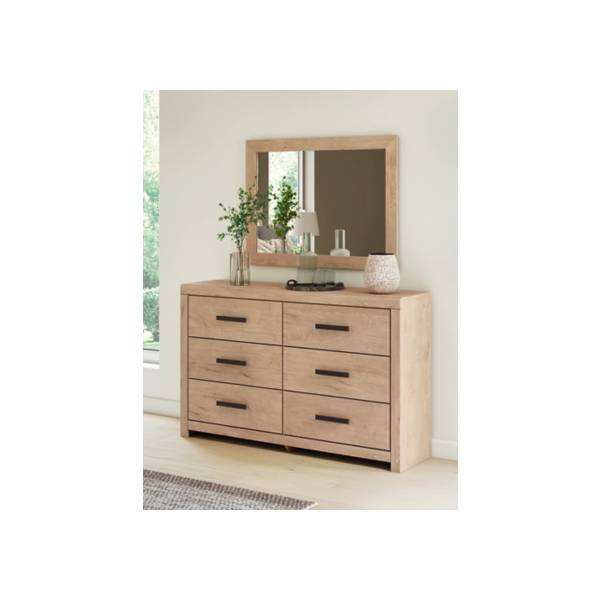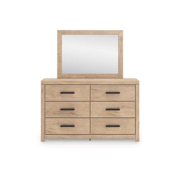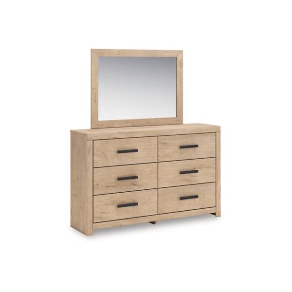 Bring a warm, modern farmhouse touch to your bedroom with the Sanginlane Dresser and Mirror set—an inviting blend of rustic charm and contemporary design, now available at Teletime. Featuring a dry, light oak finish with a subtle replicated wood grain texture, this set creates a fresh, calming atmosphere perfect for restful living.