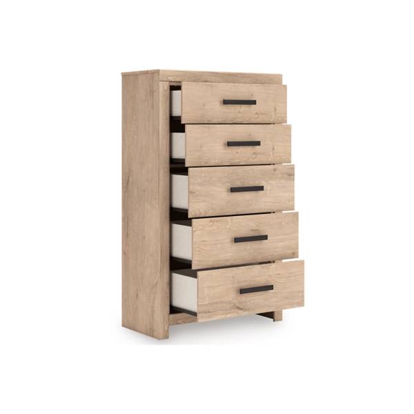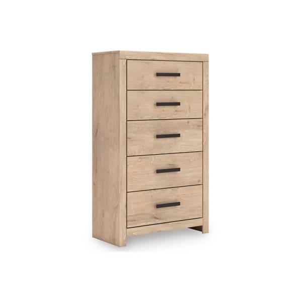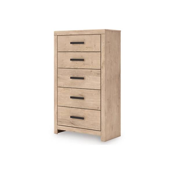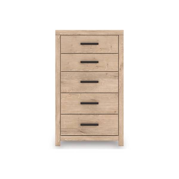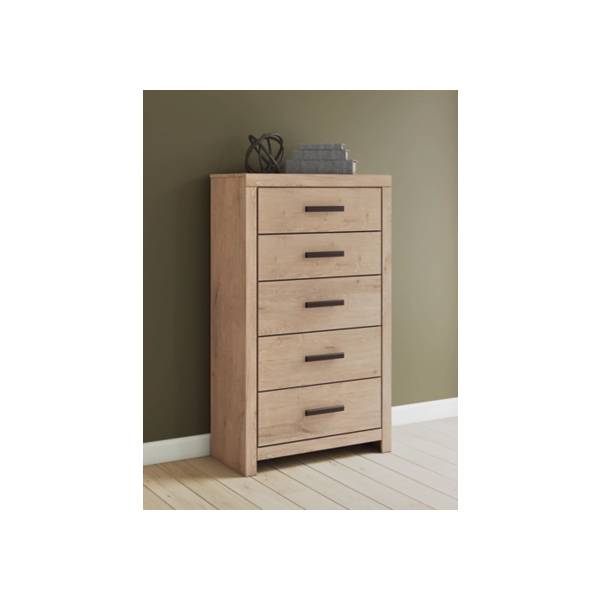 Bring a touch of modern farmhouse charm to your home with the Sanginlane Five Drawer Chest. Its light oak finish and clean lines create a fresh, airy feel, effortlessly enhancing any bedroom’s ambiance. Designed for both style and functionality, this chest offers ample storage with five spacious drawers, complemented by bold black-finished handles.