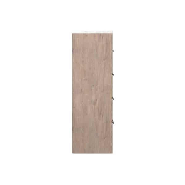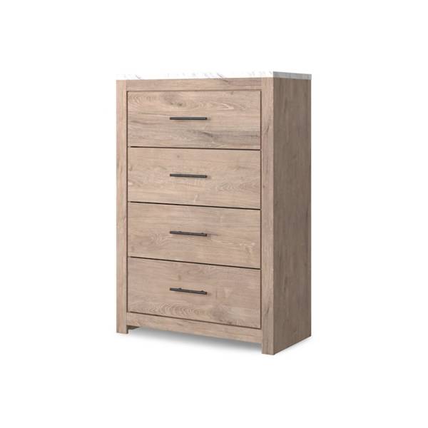 Elevate your bedroom ambiance with the casually modern Senniberg Four Drawer Chest, available exclusively at Teletime. Its light natural finish beautifully replicates oak grain, complemented by a sophisticated faux Calcutta marble top that exudes timeless elegance. The design is accented by large-scale dark handles, adding a bold and authentic touch to its sleek profile.