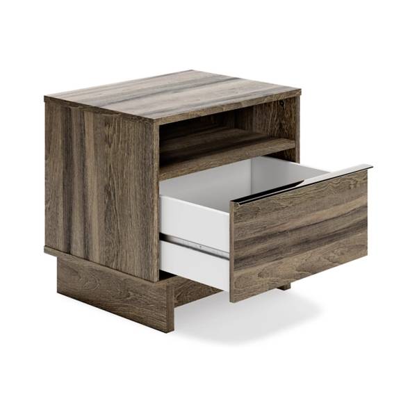 Built with engineered wood, including MDF, particleboard, and plywood, this piece balances affordability and durability. A smooth-gliding drawer with ball-bearing glides ensures effortless access to your bedside essentials, while the brushed light champagne-finished handle adds a refined touch. Below, an open shelf provides additional storage space, perfect for books, décor, or nighttime essentials.