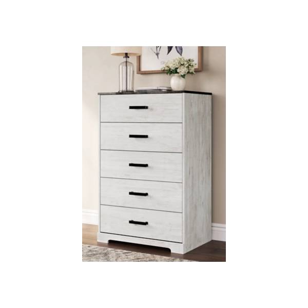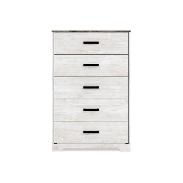 Featuring five smooth-gliding drawers with vinyl-wrapped sides and backs, this chest ensures long-lasting functionality and ample storage for your essentials. Prioritizing safety, it meets ASTM F 2057 stability standards, while fully extending drawers offer convenient access. Simple to assemble, the Shawburn Five Drawer Chest effortlessly transforms your bedroom into a cozy and stylish retreat.