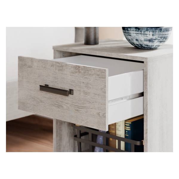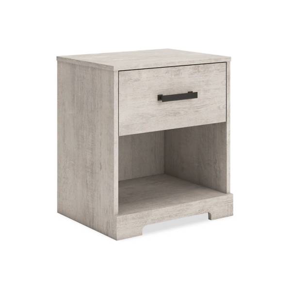 The Shawburn One Drawer Nightstand blends modern farmhouse charm with everyday functionality, creating a relaxed yet stylish addition to your bedroom—available exclusively at Teletime. Its light gray finish beautifully replicates natural oak grain, offering a soft, neutral tone that complements any decor. Designed for versatility, this nightstand is perfect for creating a warm and inviting atmosphere in your space.