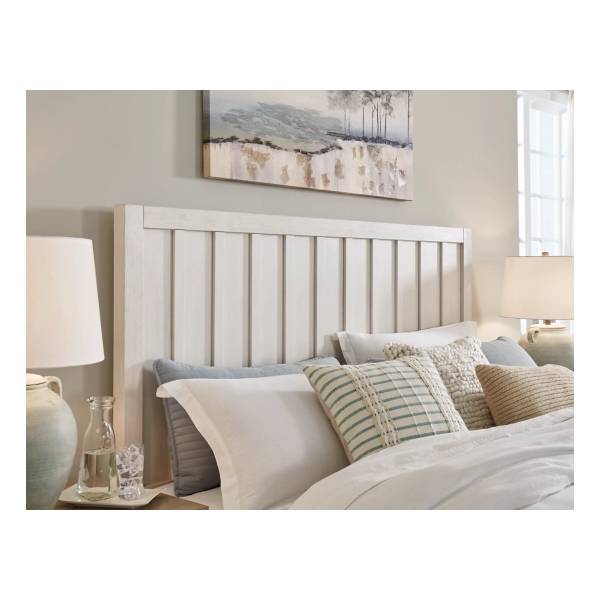 Crafted from durable hardwood solids, veneers, and MDF substrates, the Shaybrock King Panel Bed combines strength with style. The two-tone finish, featuring an antiqued white hue and light gray wood tone, creates a sophisticated yet inviting look that complements a variety of interior design styles.