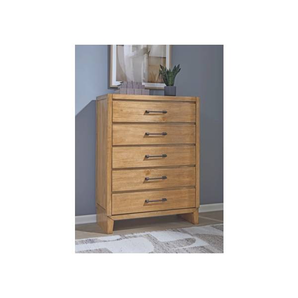 Adding to its sleek design, the chest is equipped with metal drawer pulls in a darkened bronze-tone finish, providing a stylish contrast to the light wood-tone finish. This combination of aesthetics and functionality makes the Sherbana Five Drawer Chest an exquisite piece for any modern bedroom. It requires minimal assembly, offering convenience alongside its striking design. Exclusively available at Teletime, this chest is the perfect blend of style, quality, and effortless sophistication.