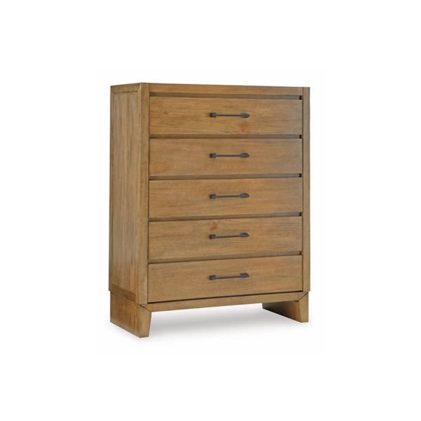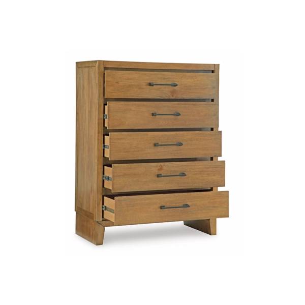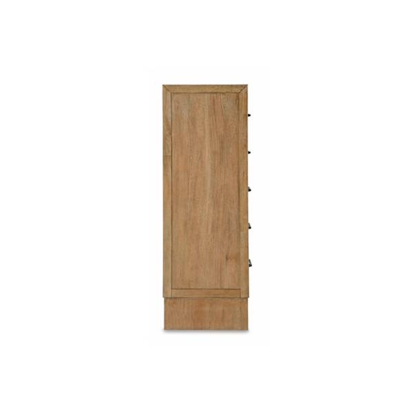 The Sherbana Five Drawer Chest offers spacious storage with a light wood-tone finish that complements various bedroom decors. Its metal drawer pulls with darkened bronze-tone finish add a touch of sophistication. The chest features five smooth-gliding drawers with fully finished interiors, dovetail construction, and heavy-duty ball-bearing side glides, ensuring durability and ease of use. The top drawers are felt-lined, providing a soft space for delicate items. Constructed with hardwood solids, mango wood veneer, and MDF substrate, it combines strength and style
