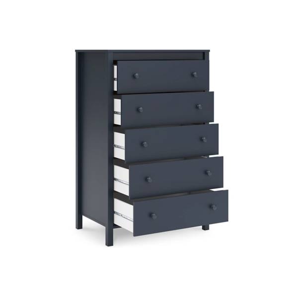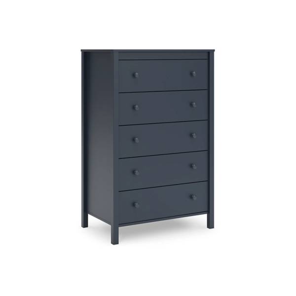 The Simmenfort Five Drawer Chest from Teletime offers a harmonious blend of classic Shaker-style design and modern appeal, making it a standout piece for any bedroom. Its striking matte navy blue finish brings a bold yet sophisticated touch, perfectly complementing farmhouse, coastal, or transitional décor. Clean, crisp lines and sleek hardware in a matching matte navy hue contribute to its understated elegance, offering a fresh take on timeless design.